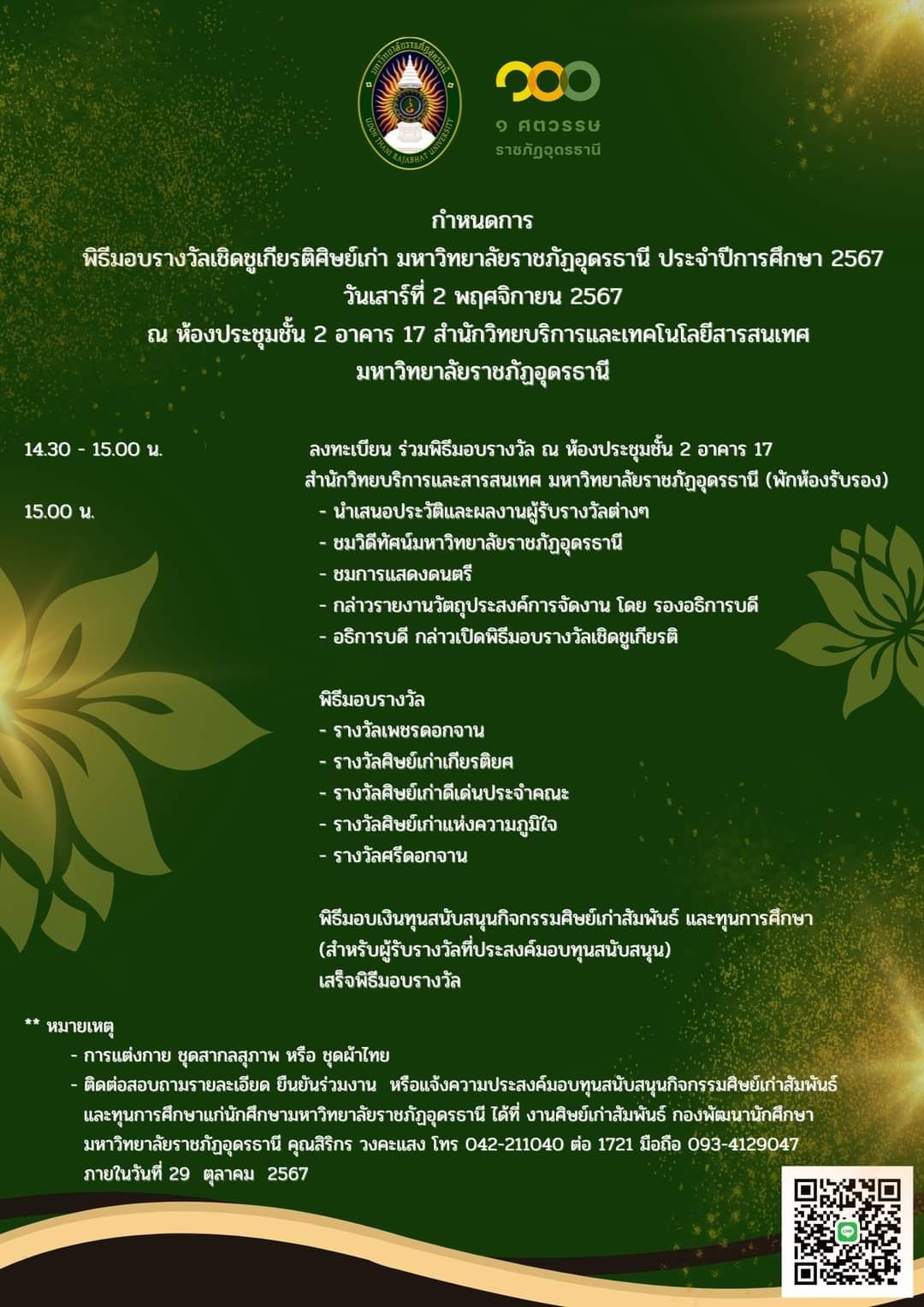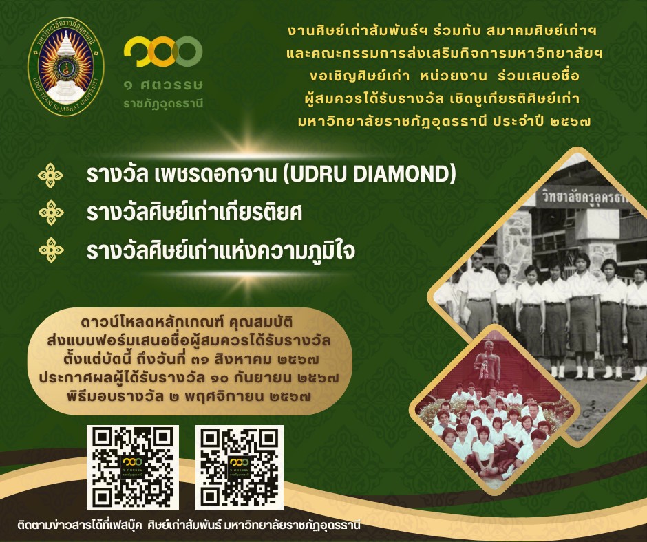 กำหนดการ พิธีมอบรางวัลเชิดชูเกียรติศิษย์เก่า มหาวิทยาลัยราชภัฏอุดรธานี ประจำปีการศึกษา 2567 17 ต.ค.,2024 webmasterใส่ความเห็น กำหนดการ พิธีมอบรางว …